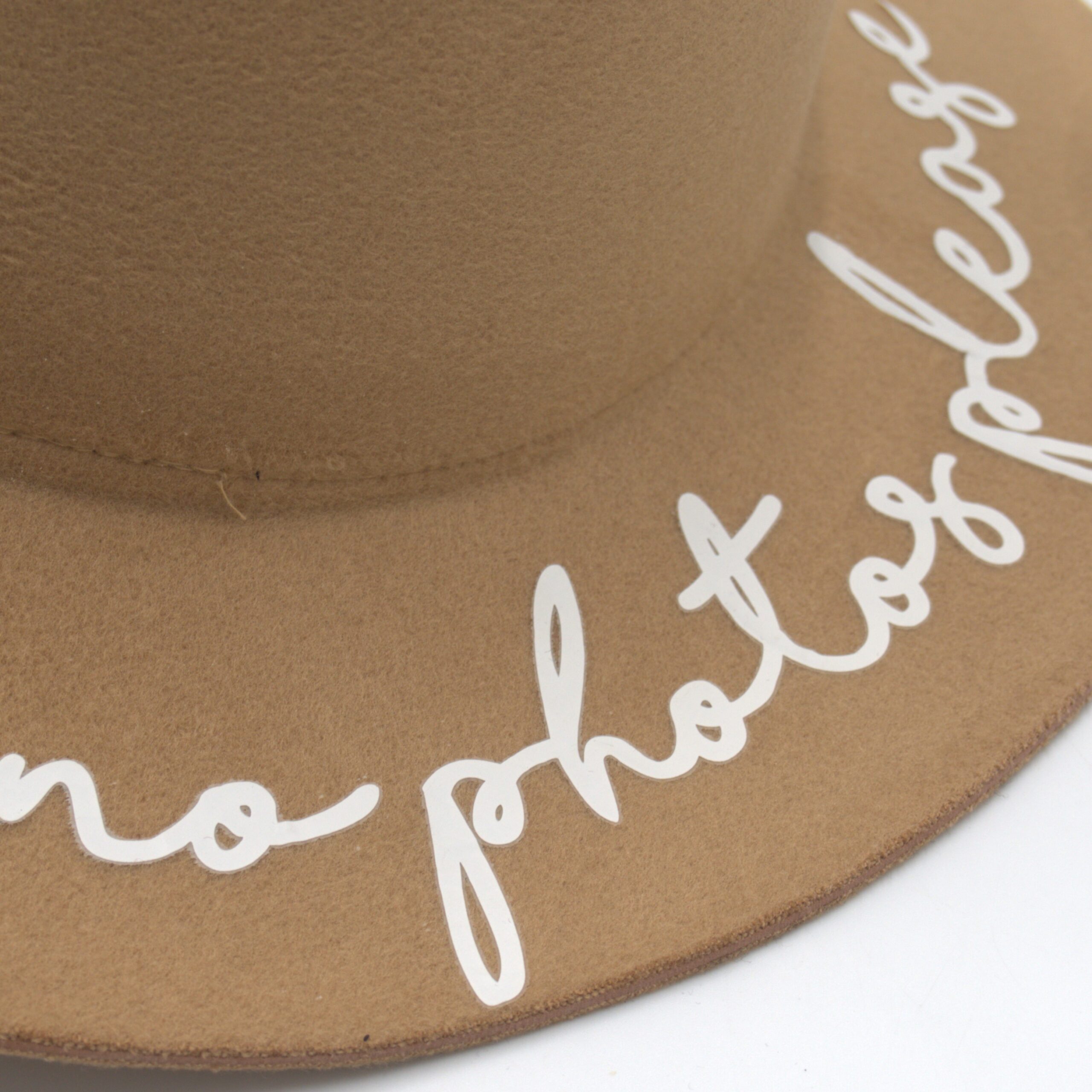 Starannie wykonany jasno brązowy kapelusz filcowy z napisem „no photos please” będzie ozdobą twojej stylizacji, idealny na każdą okazję i dedykowany kobietom w każdym wieku. Elegancki, szykowny i przyjemny w dotyku kapelusz posiada profilowany środek dzięki czemu świetnie się układa i trzyma na głowie, żaden silny wiatr nie jest mu straszny:)