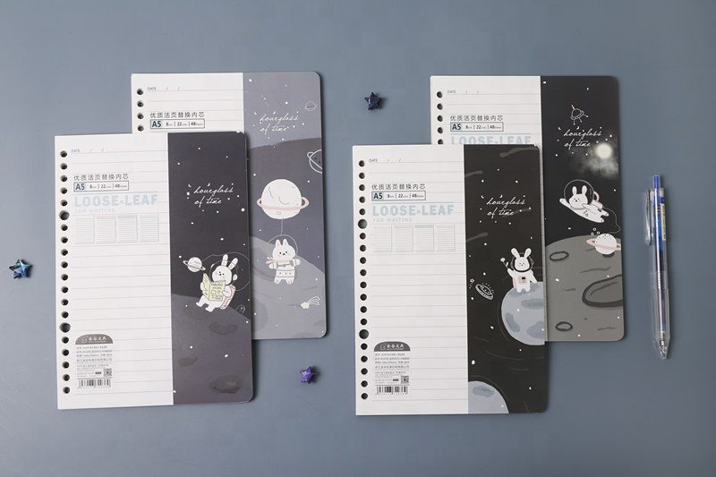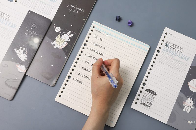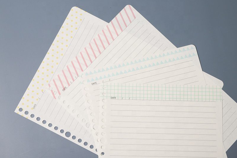 - na górze kartek 4 wzorki (żółte kropki, różowe paseczki, turkusowe trójkąciki, zielona kratka)