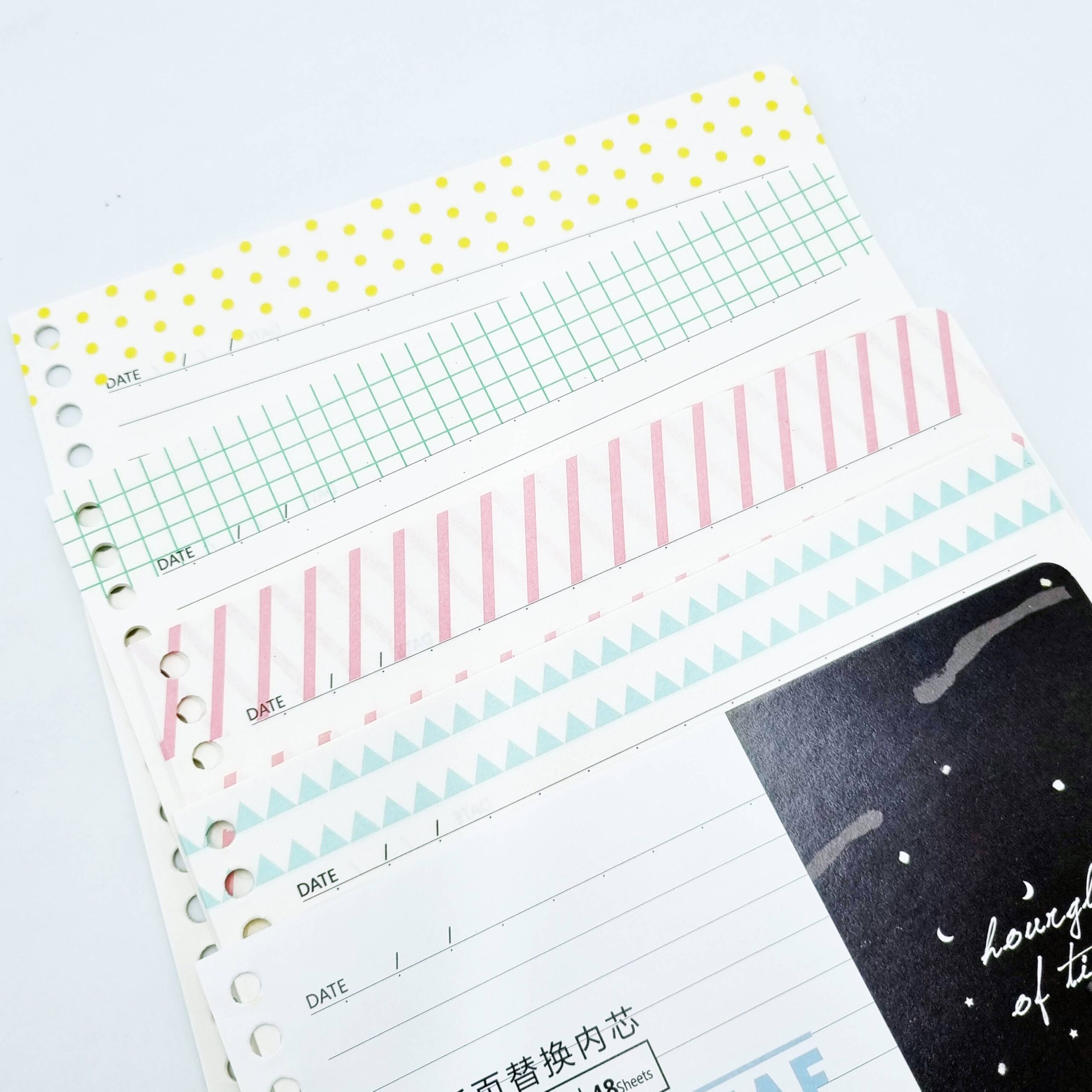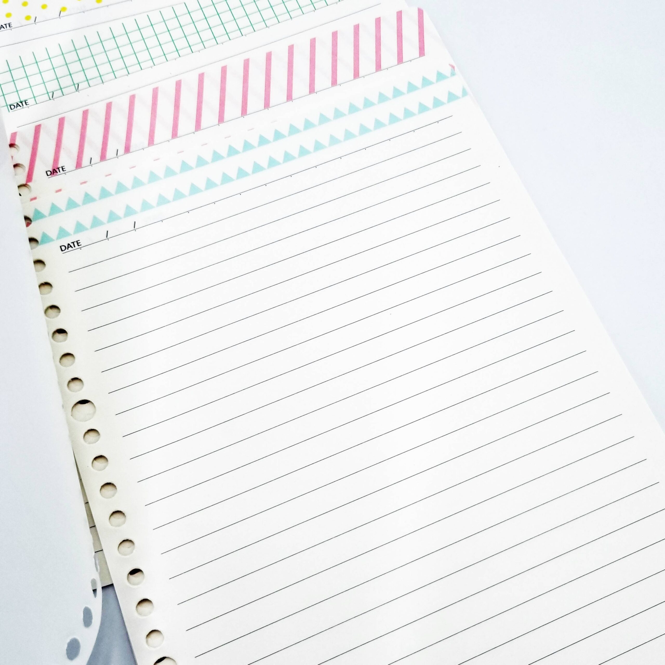 - na górze kartek 4 wzorki (żółte kropki, różowe paseczki, turkusowe trójkąciki, zielona kratka)