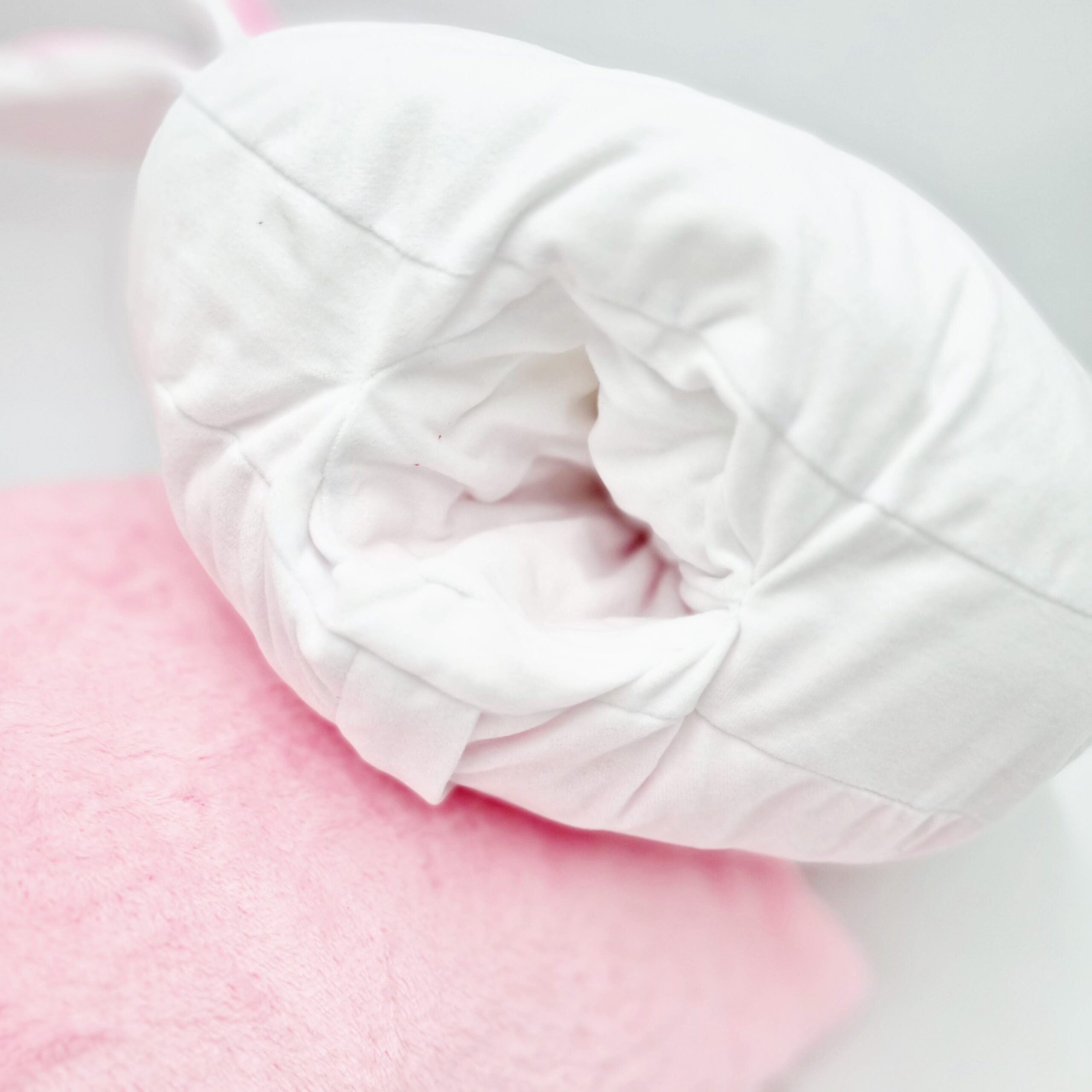 Koc połączony z maskotką, która zarówno jest i poduszką i gadżetem do ogrzania rąk.