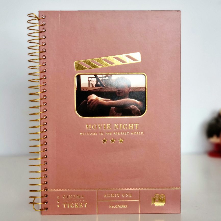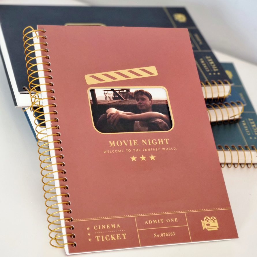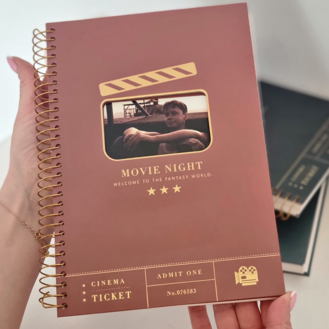 Okładka nawiązuje do stylistyki kinowej, zawierając grafikę klapsa filmowego, napis „MOVIE NIGHT” oraz motywy imitujące bilety kinowe z numeracją sprawiają, że notes będzie idealnym gadżetem dla miłośników kinematografii.