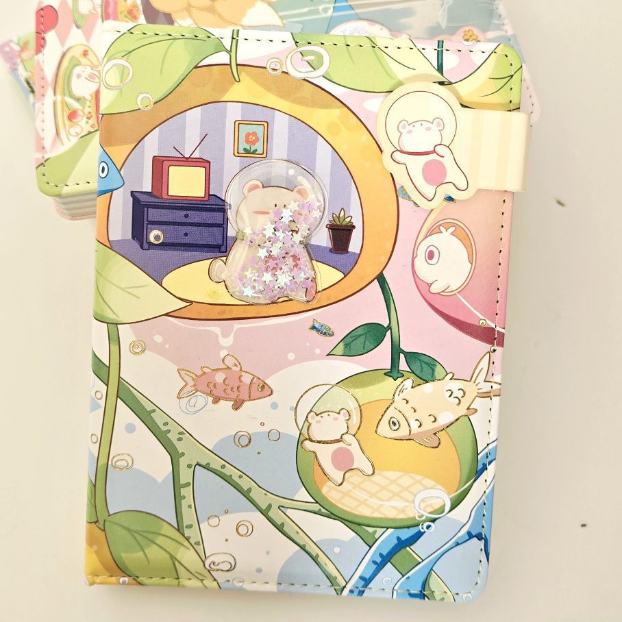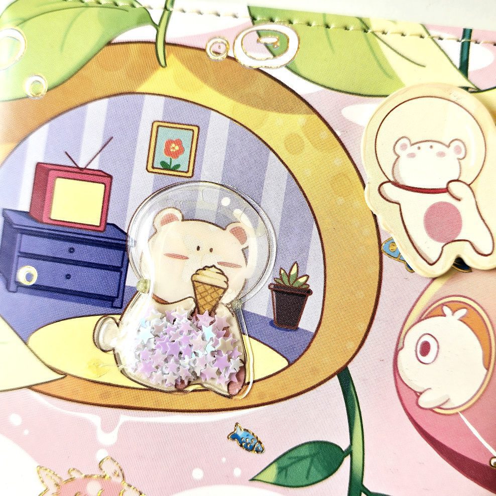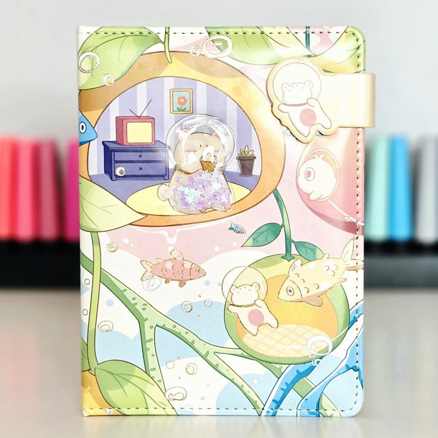 Uroczy notes, pamiętnik na magnes o estetyce japońskiej-kawaii, przedstawiające postać misia astronauty. Okładka zdobiona jest kolorową, fantazyjną ilustracją w pastelowych kolorach, przedstawiająca motywy kosmiczne połączone z naturą (np. ryby w bańkach, rośliny).