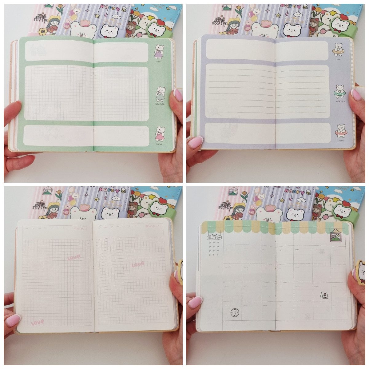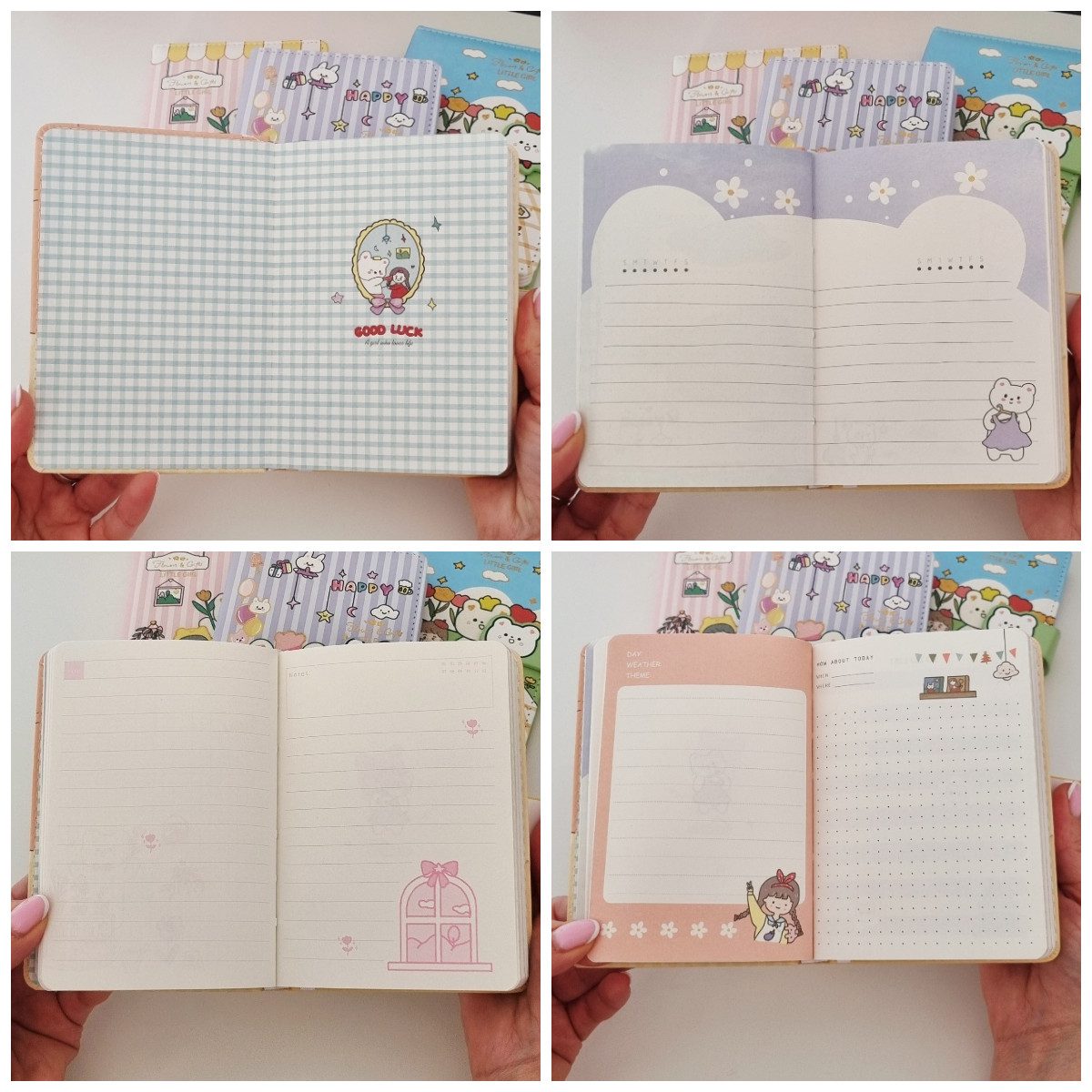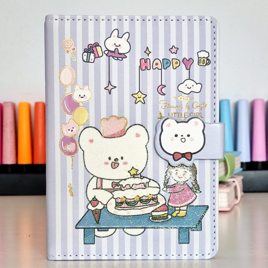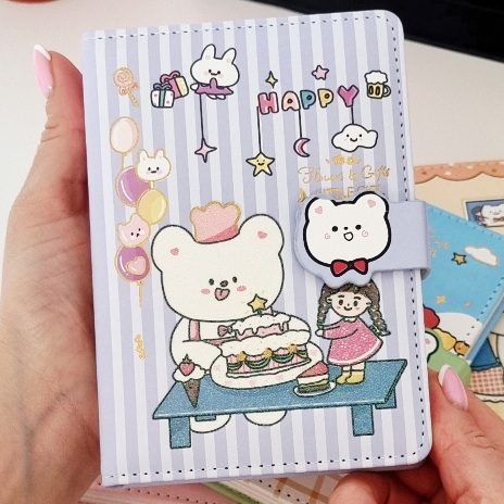 Ten uroczy notes to kolorowy pamiętnik w stylu kawaii, który idealnie nadaje się do zapisywania codziennych myśli lub jako kreatywny planer. Charakteryzuje się on funkcjonalnym zapięciem na magnetyczną klamrę, ozdobioną wypukłą głową białego misia z czerwoną kokardką.