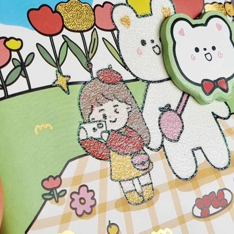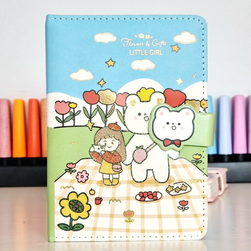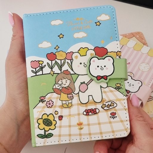 Ten uroczy notes to kolorowy pamiętnik w stylu kawaii, który idealnie nadaje się do zapisywania codziennych myśli lub jako kreatywny planer. Charakteryzuje się on funkcjonalnym zapięciem na magnetyczną klamrę, ozdobioną wypukłą głową białego misia z czerwoną kokardką.