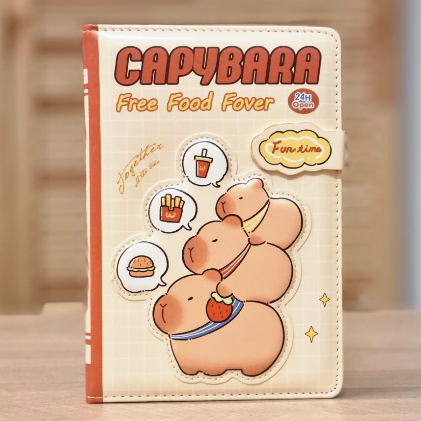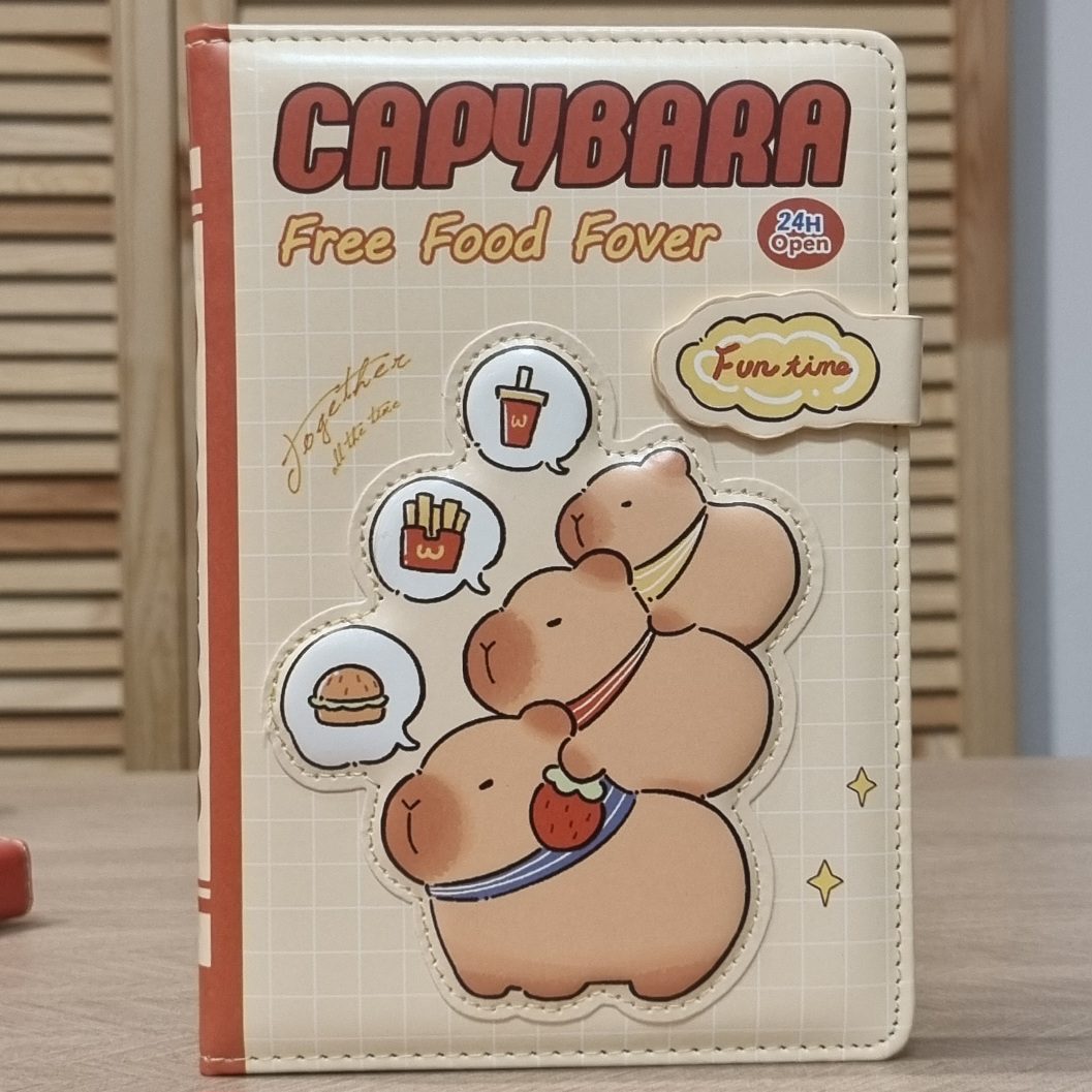 Poznajcie nasz uroczy notes z motywem kapibary. Produkt, charakteryzuje się grafiką w stylu „kawaii”, przedstawiającymi kapibary w towarzystwie jedzenia (cola, frytki, hamburger:) )