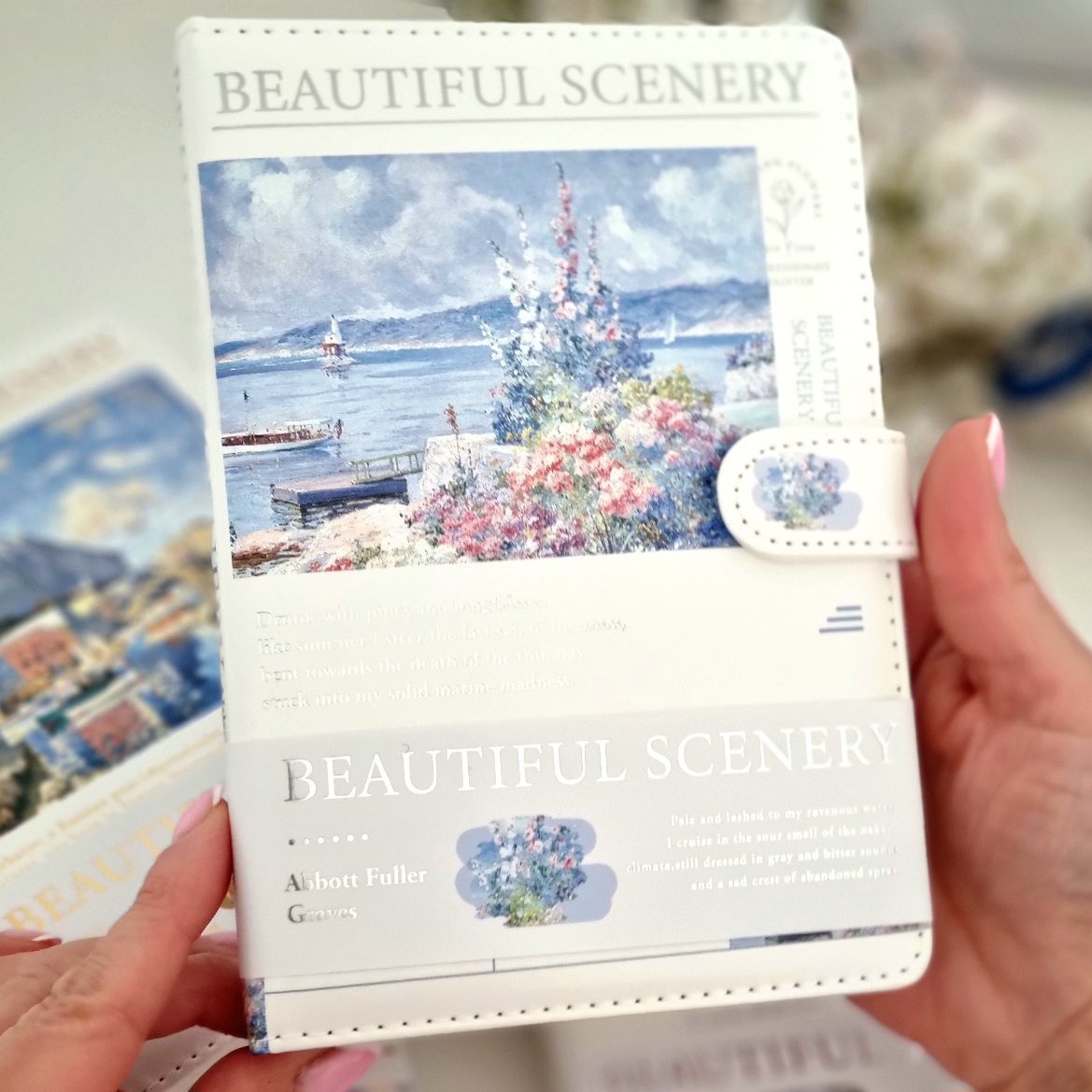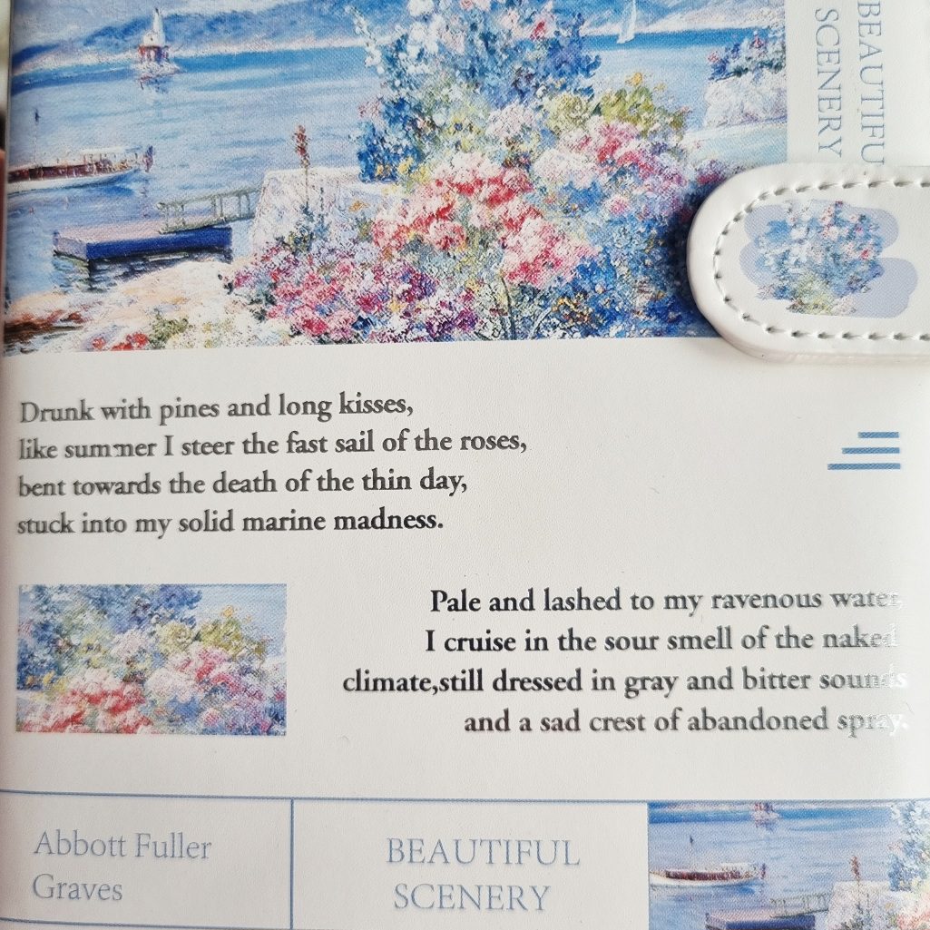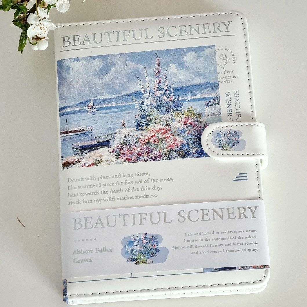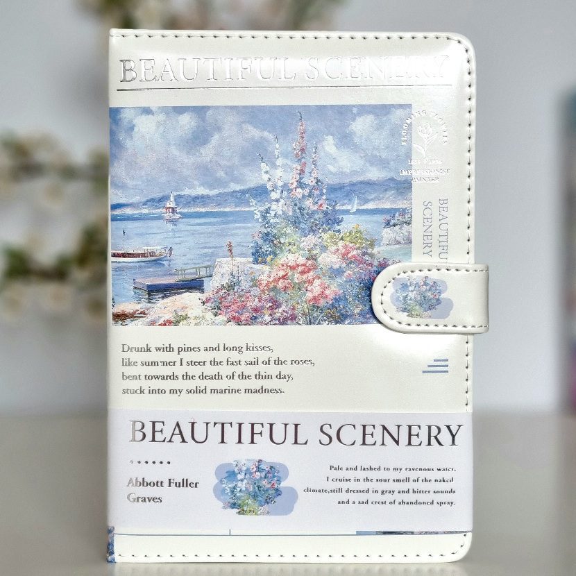 Poznajcie nasz piękny notatnik, notes w skóropodobnej oprawie z serii Beautiful Scenery. Główym motywem notesu jest nadmorski krajobraz z kwiatami, dzieło impresjonistyczne Abotta Fullera Gravesa.