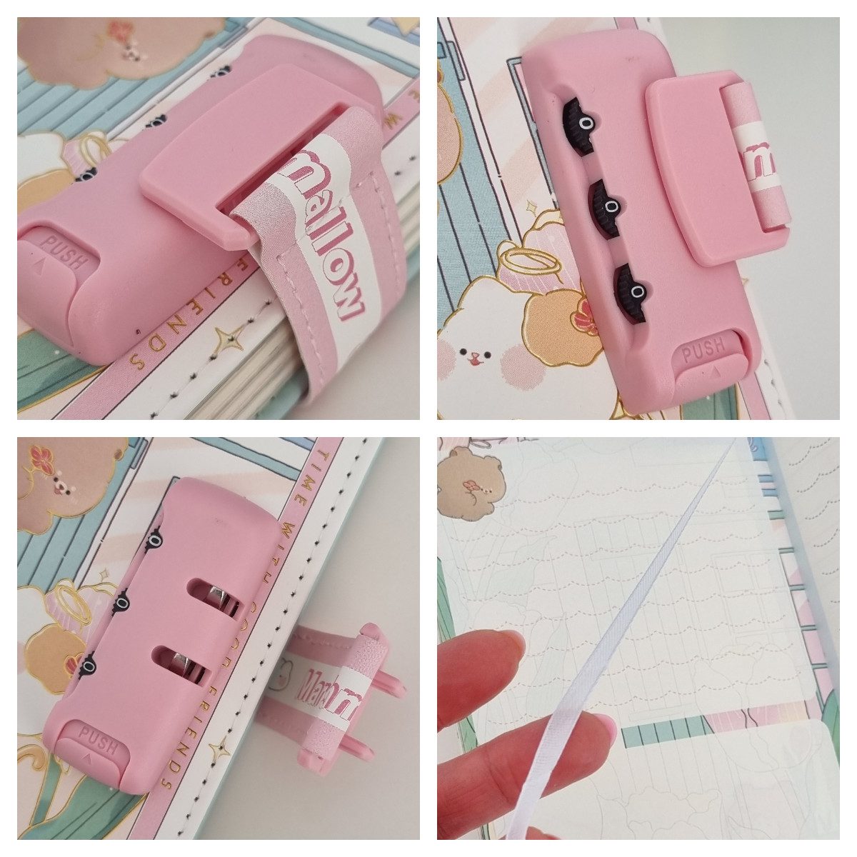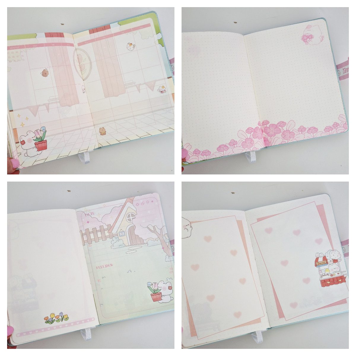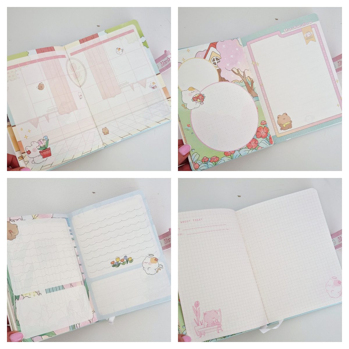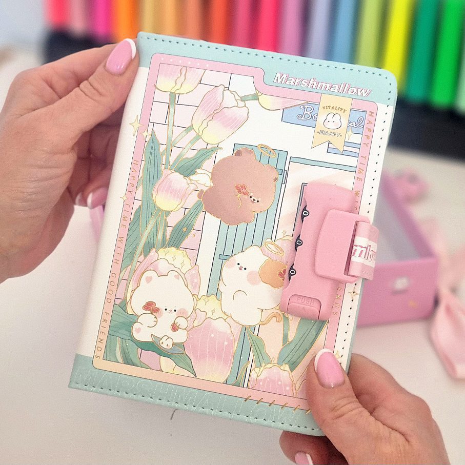 Wnętrze notesu to bogato ozdobione kartki w stylu kawaii, z miesięcznymi i tygodniowymi planerami zadań. Pamiętnik posiada ilustrowane strony w linię w kratkę lub puste-ozdobione postaciami takimi jak misie, kotki i króliki. Każda kartka to unikalne tło co zachęca do kreatywnego notowania i prowadzenia dziennika.