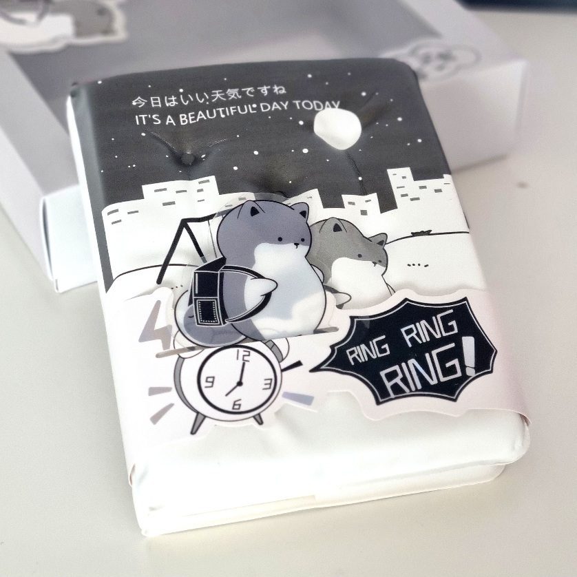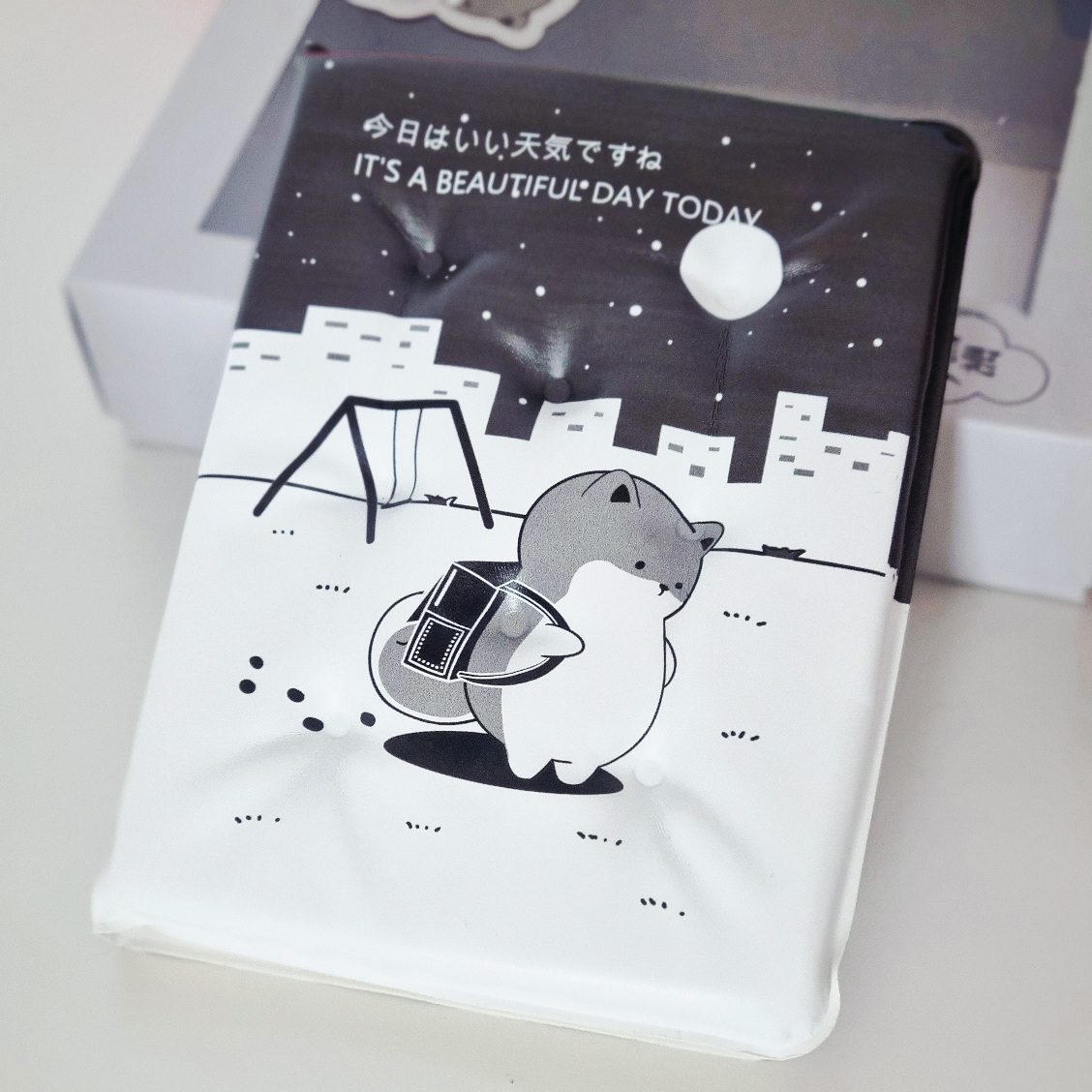 Produkt, charakteryzuje się grafiką w stylu japońskim „kawaii”, przedstawiającą pieska z plecakiem wracającego ze szkoły na tle nocnego miasta i placu zabaw, z japońskim napisem 今日は素晴らしい天気です co oznacza „DZIŚ JEST PIĘKNA POGODA” (z angielskim tłumaczeniem poniżej)