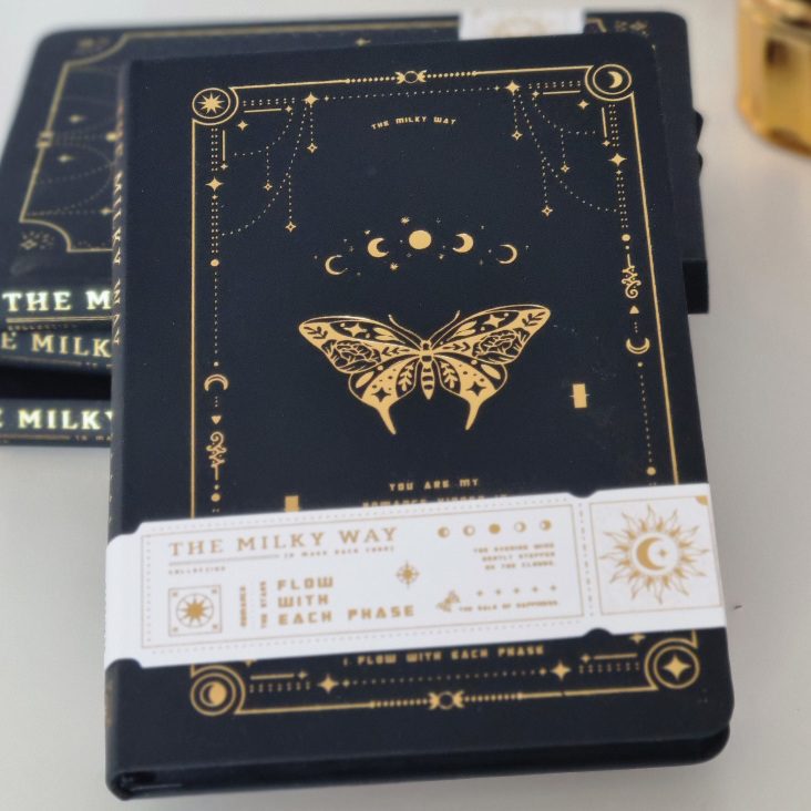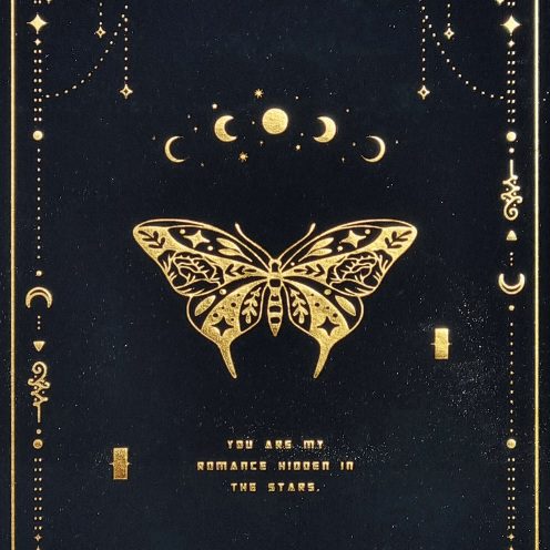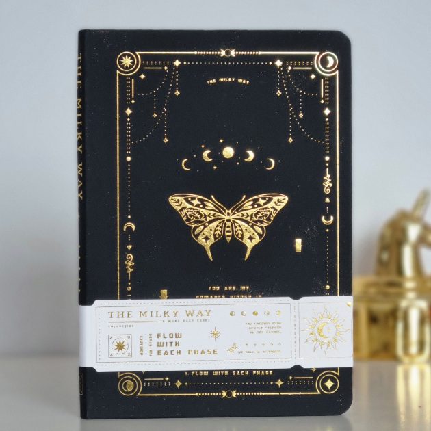 Stylowy, czarny notatnik B6 z motywem motyla, czarnymi kartami i złotymi detalami idealny do kreatywnego pisania białymi , metalicznymi lub neonowymi żelopisami.Charakteryzuje się czarną, twardą oprawą ze złotymi zdobieniami, motywach astralnych i przyrodniczych takich jak motyle, księżyc i gwiazdy.