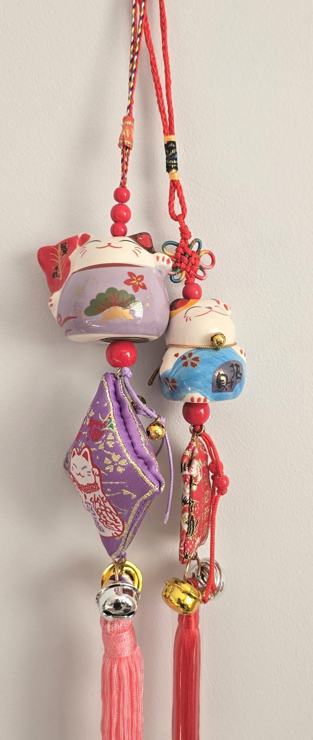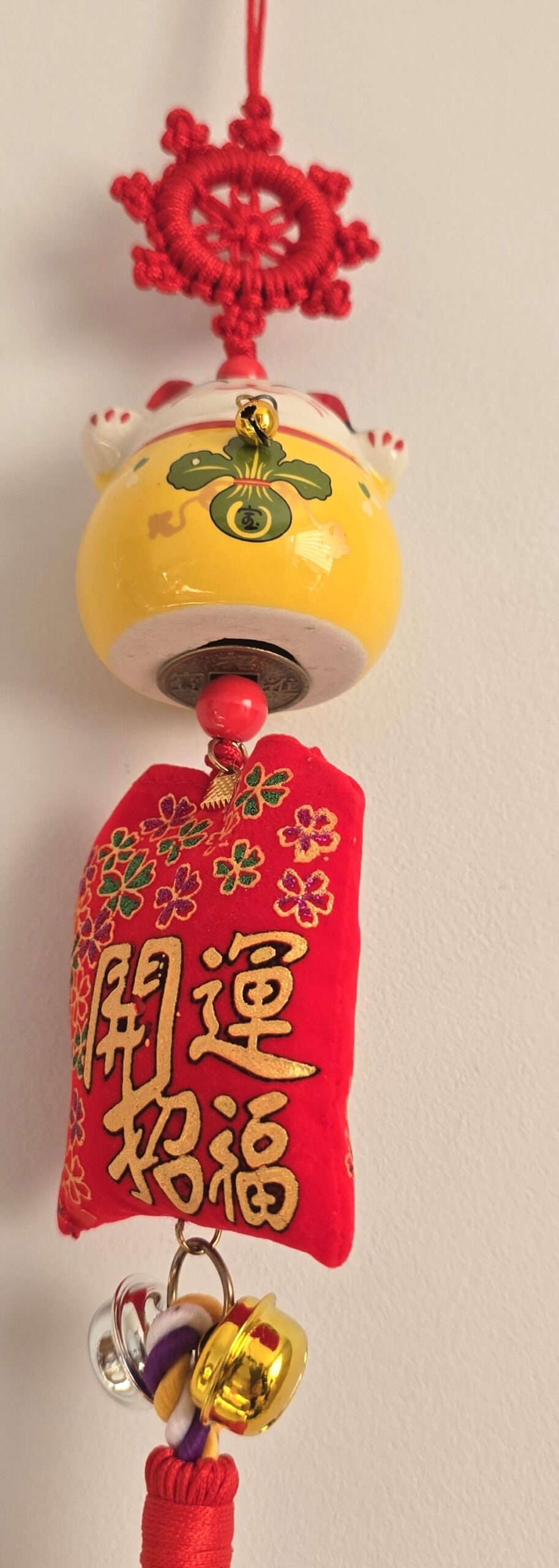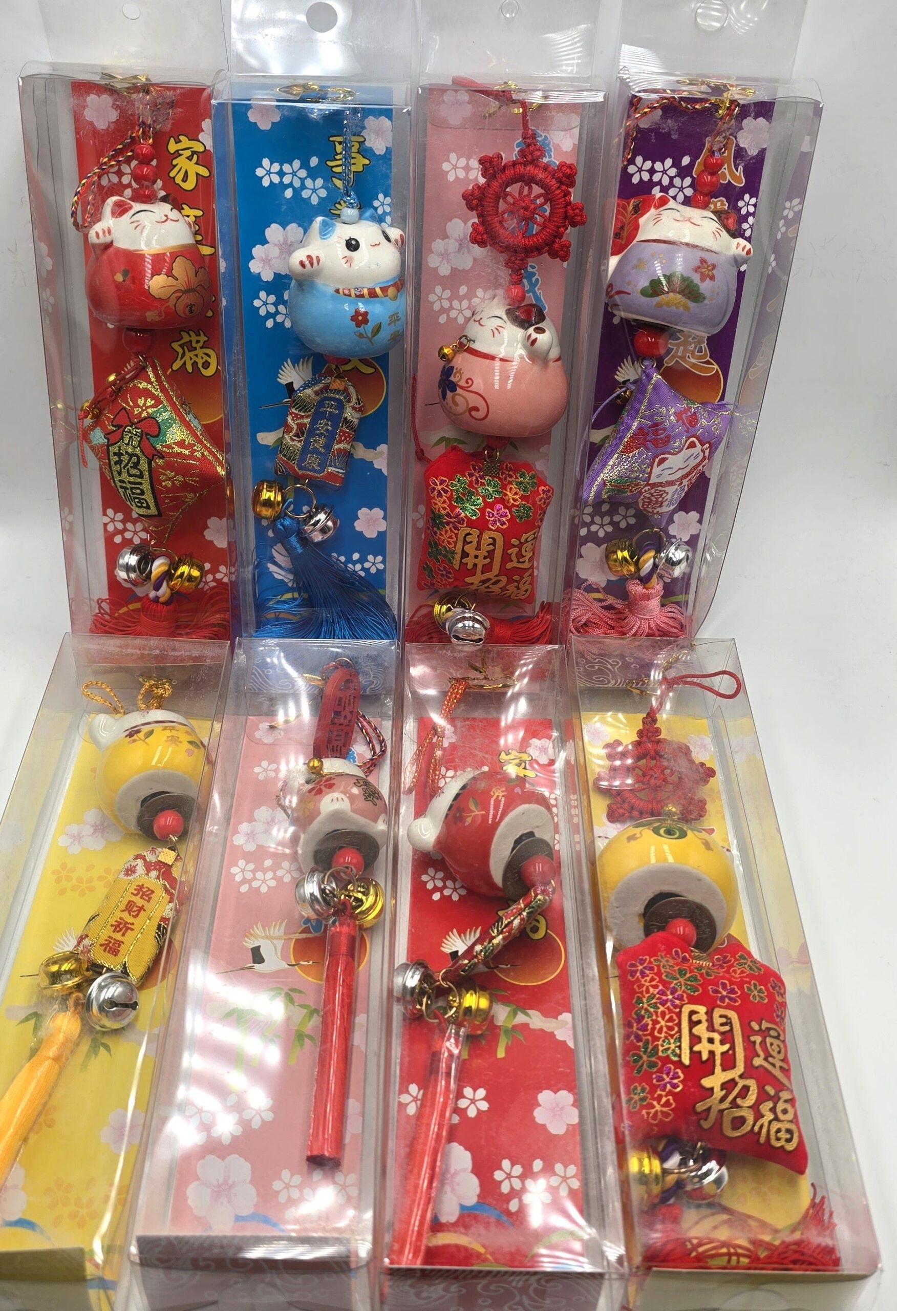 Zawieszki ozdobione są dekoracyjnymi akcentami, poduszeczkami, dzwoneczkami oraz chińskimi znakami oznaczającymi m.in. szczęście, dobrobyt i przyciąganie pieniędzy. Doskonale sprawdzą się jako: