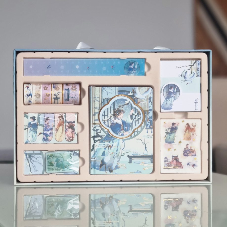 W skład zestawu wchodzi: notes  z serii „Deszczowe morze”, karteczki indeksujące, linijka, 5 szt. taśm ozdobnych, zakładki magnetyczne (4 szt.), arkusze z naklejkami, magnes. Wszystko zapakowane w estetyczny kartonik z uchwytem.