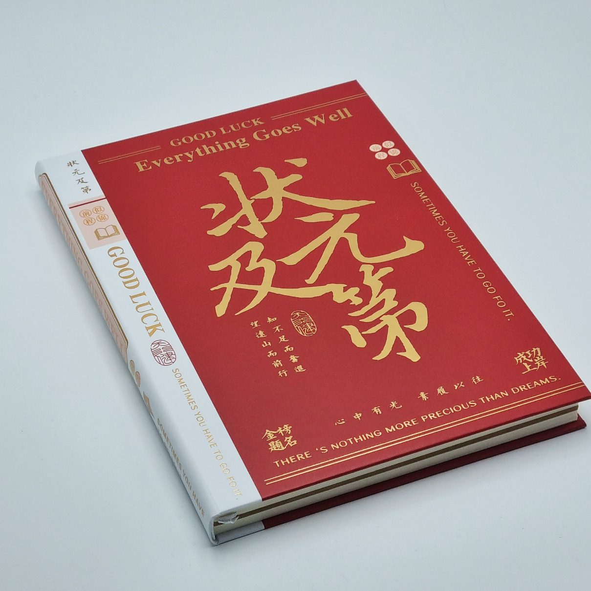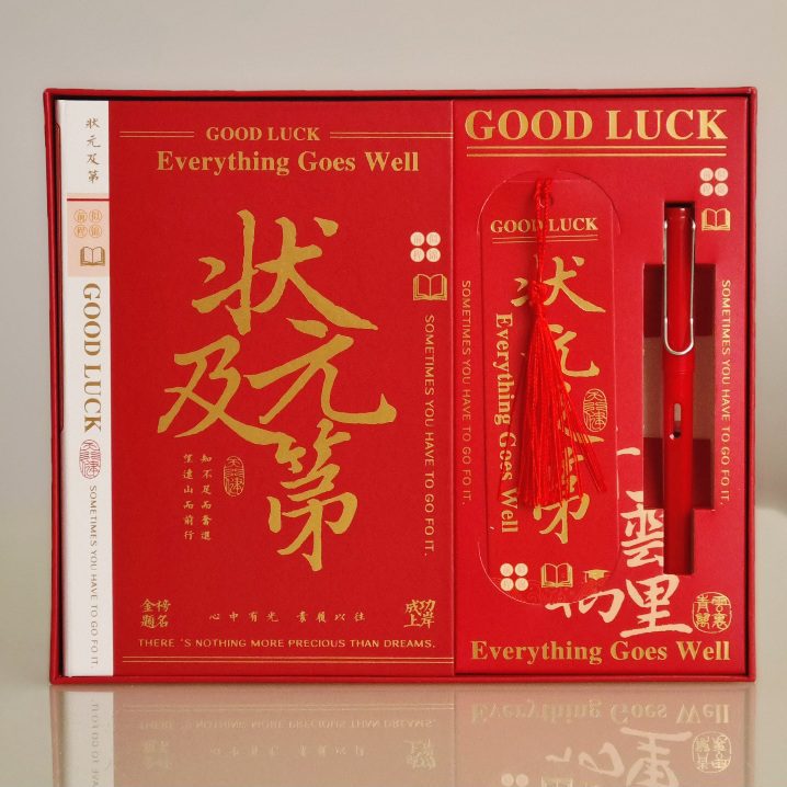 W skład zestawu wchodzi: notes z serii „Good Luck”, pióro oraz zakładka z frędzlem. Wszystko zapakowane w estetyczny kartonik i torebkę prezentową.